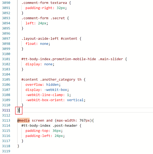 @media screen and (max-width:767px) 라고 써져 있고 그 옆에 ' { ' 가 보이실 겁니다. 이게 무슨 의미인가 하면, 가로 뷰어 767px 이하인 뷰어에서는 아래 { } 안의 내용을 적용시킨다, 하는 그런 의미입니다.