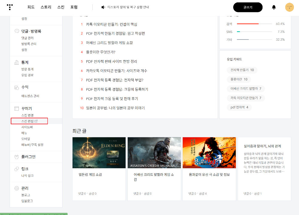 관리에서 <스킨 편집>을 클릭하시면 스킨 편집 창으로 들어갈 수 있습니다.